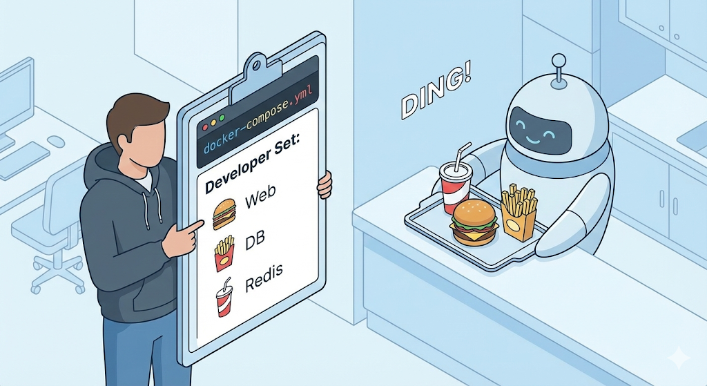 ‘도커 컨테이너와 서비스’의 차이를 햄버거 세트 메뉴 비유로 쉽게 설명하고, 복잡한 인프라 주문(배포)을 해결하기 위한 도커 컴포즈(Docker Compose)의 필요성을 다룹니다.