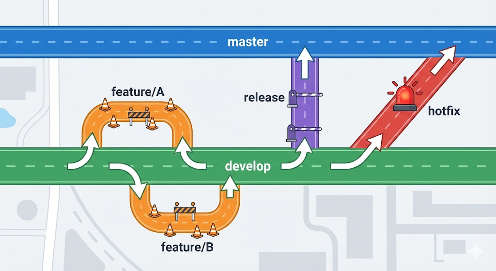‘GitFlow 전략’의 개념과 실무 적용법을 설명합니다. 긴급 버그와 신규 기능이 동시에 터졌을 때, feature/hotfix 브랜치로 작업을 격리하는 방법과 GitLab CI 연동까지 다룹니다.