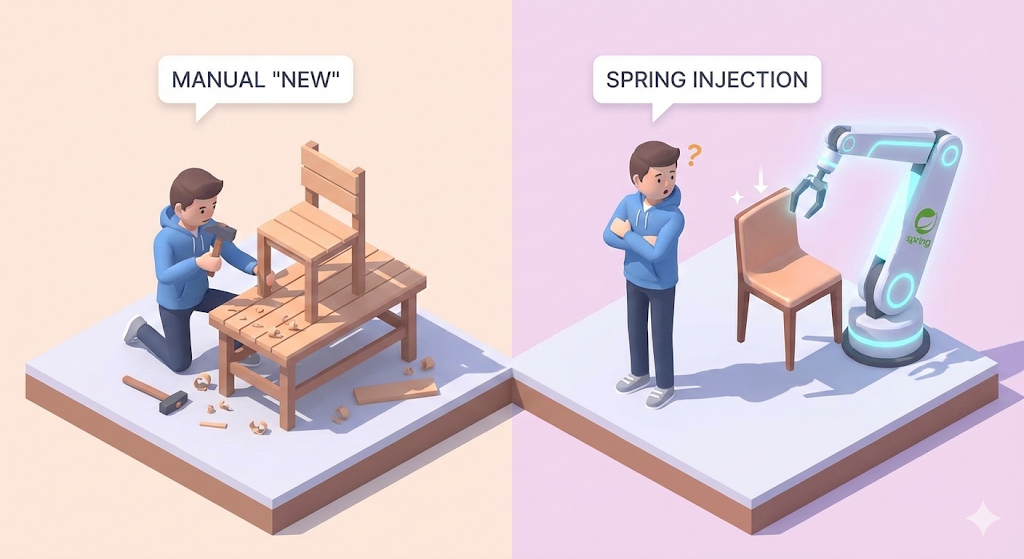 스프링 부트와 프레임워크의 개념을 쉽게 설명하고, 제어의 역전(IoC)과 의존성 주입(DI)이 필요한 이유를 코드 예제와 함께 다룹니다.