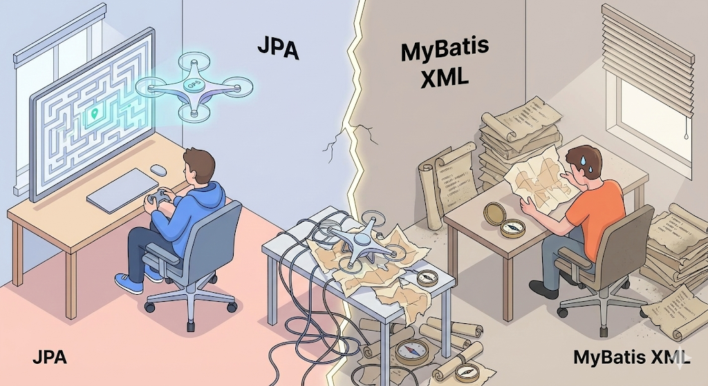 ‘MyBatis vs JPA’의 갈등을 겪으며 깨달은 실무 경험담. JPA N+1 문제 해결과 두 기술의 장단점을 살린 효율적인 공존(하이브리드) 전략을 제시합니다.
